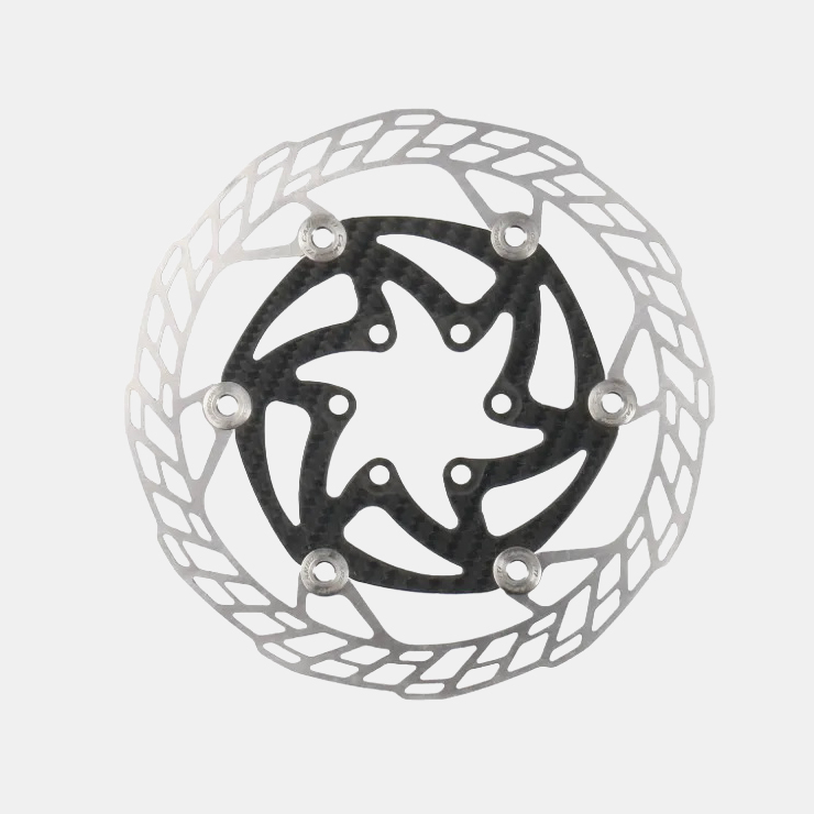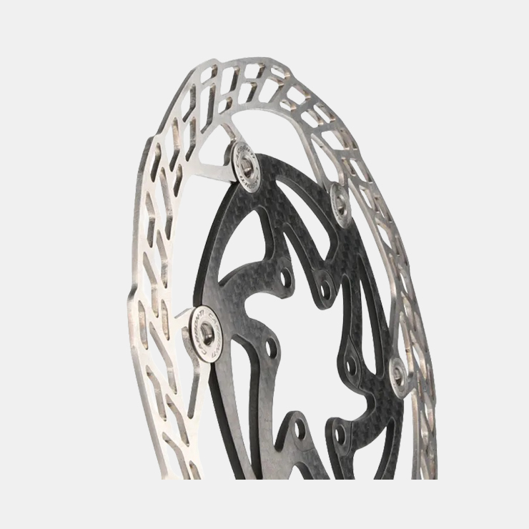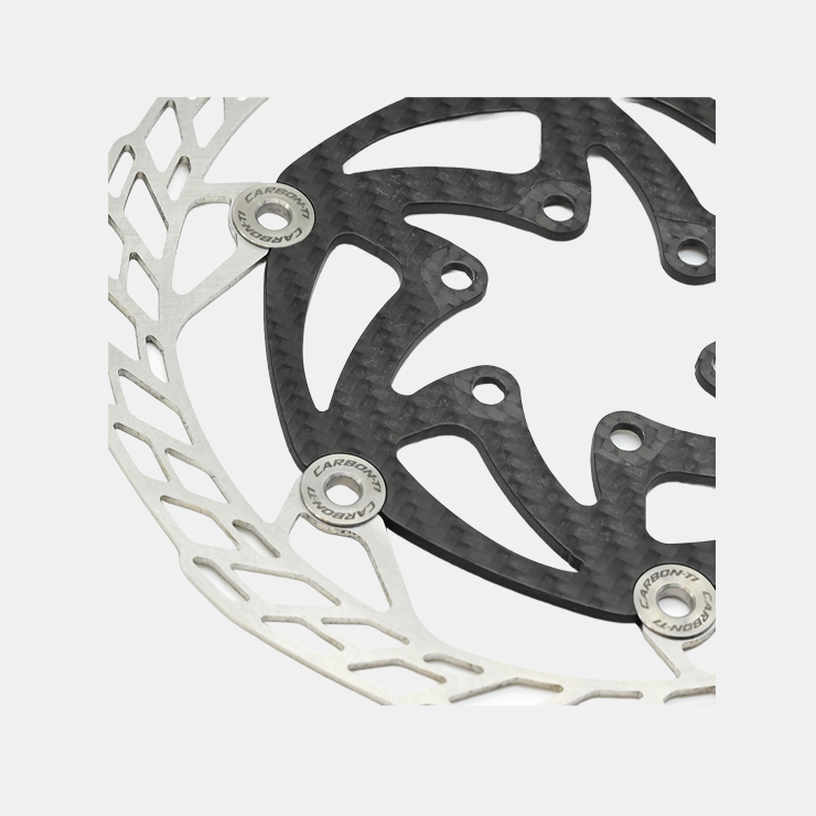 Superlight semi-floating disc rotor with steel braking surface, carbon fiber inner body and laser etched titanium fixing rivets. The braking surface has a special design that reduces wear of the pads ensuring optimum braking power and heat dissipation. The gold-colored ceramic treatment ensures high performance and long life. Can be used with any pads.