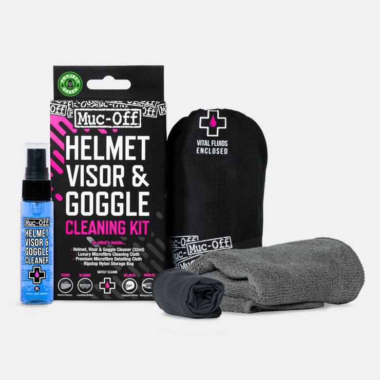 Are you tired of cleaning your helmet and goggles with pieces of tissue or the sleeve of your jersey? Then this kit’s for you! The Visor, Lens and Goggle cleaning Kit is ideal for keeping in your ride pack for quick and safe cleaning on the move. It quickly removes dust, mud, insects, soot and oily residue from your helmet and goggles leaving a streak free finish. Each kit contains a premium quality microfibre cloth that has been specifically designed to clean delicate finishes. The pack also includes a 30ml spray bottle containing an advanced pH balanced, biodegradable cleaning formula, as well as a luxury microfibre cloth.