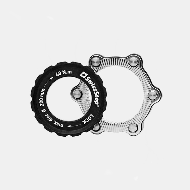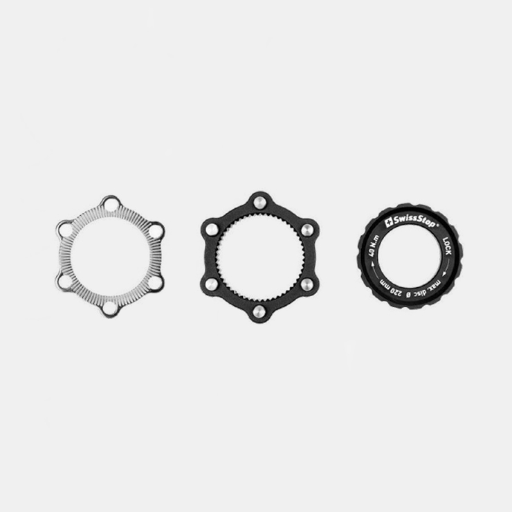 The SwissStop Centerlock 6-bolt adapter allows the installation of 6-hole brake discs on hubs with centerlock receptacle.